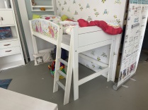 Exklusives Lifetime Halbhochbett mit schräger Leiter, Prinzessin-Absturzsicherung, Lattenrost und Sicherheitsschutzleisten in Aluminim.